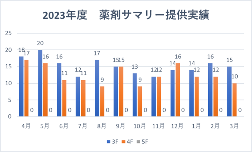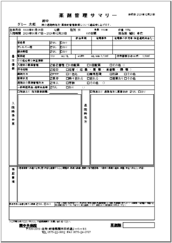また、上記以外にかかりつけ医や今後受診される医療機関には、当院を退院される患者様に限り、「薬剤サマリー」というA4サイズのお手紙もお渡ししています。剤サマリーは、お薬手帳による情報提供よりもより詳細な情報を提供でき、「入院時持参薬」と「退院時処方」が比較できる上、患者様の内服状況や処方変更の経緯、さらに1部の検査値も掲載しています。