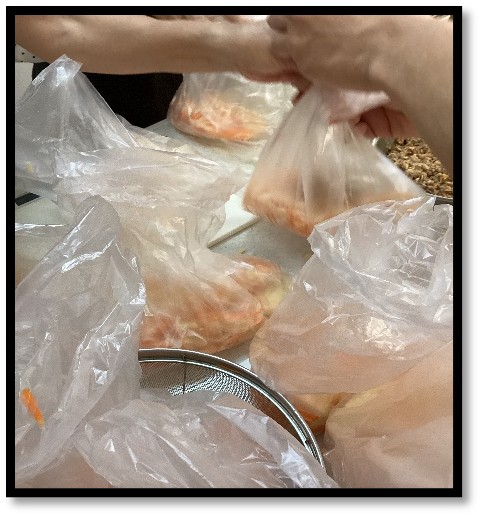 また野菜は切ってそのままアイラップに入れ、火が通ってからカレールーとお湯を入れ、袋を軍手をはめたまま揉んで潰すという方法の調理を試みました。意外と熱く、軍手も2枚重ねが必要と体験からわかったこともありました。