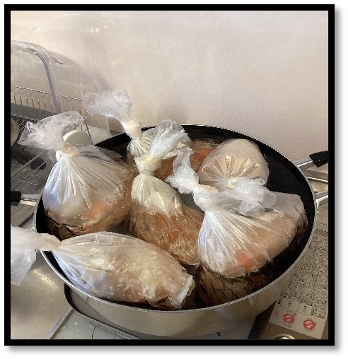 災害時では水は大変貴重となります。なので実際の炊き出し同様今回は、コメをとがずにアイラップにいれ水をそのまま袋にいれ、沸いたお湯に袋を浮かべてご飯を炊くという方法を試してみました。意外とコメが匂うことなく食べることができ、うまくご飯を炊くことができていました。